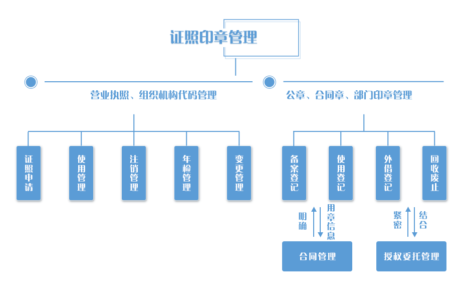 證照印章作為企業(yè)重要印信,由于證照印章其本身具有法律效力,因此必須規(guī)范其使用。證照印章管理模塊能夠?qū)ζ髽I(yè)工商類、資質(zhì)類、產(chǎn)權(quán)類證照,公章、合同章、法人章、部門章等印章進(jìn)行管理,證照印章的領(lǐng)用和借出需要與授權(quán)委托書緊密耦合,并且需要登記使用記錄。