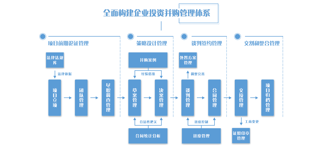 在充分借鑒了工程項(xiàng)目管理體系的基礎(chǔ)上,對(duì)投資并購(gòu)管理模塊劃分為項(xiàng)目立項(xiàng)、項(xiàng)目團(tuán)隊(duì)管理、盡職調(diào)查管理、并購(gòu)方案、合約談判、合同管理、交接管理、項(xiàng)目歸檔、進(jìn)度管理、經(jīng)驗(yàn)庫(kù)管理等重要管理階段,能夠幫助企業(yè)快速構(gòu)建投資并購(gòu)體系,有效實(shí)施管理投資并購(gòu)項(xiàng)目,從而最大程度的降低投資并購(gòu)風(fēng)險(xiǎn)。